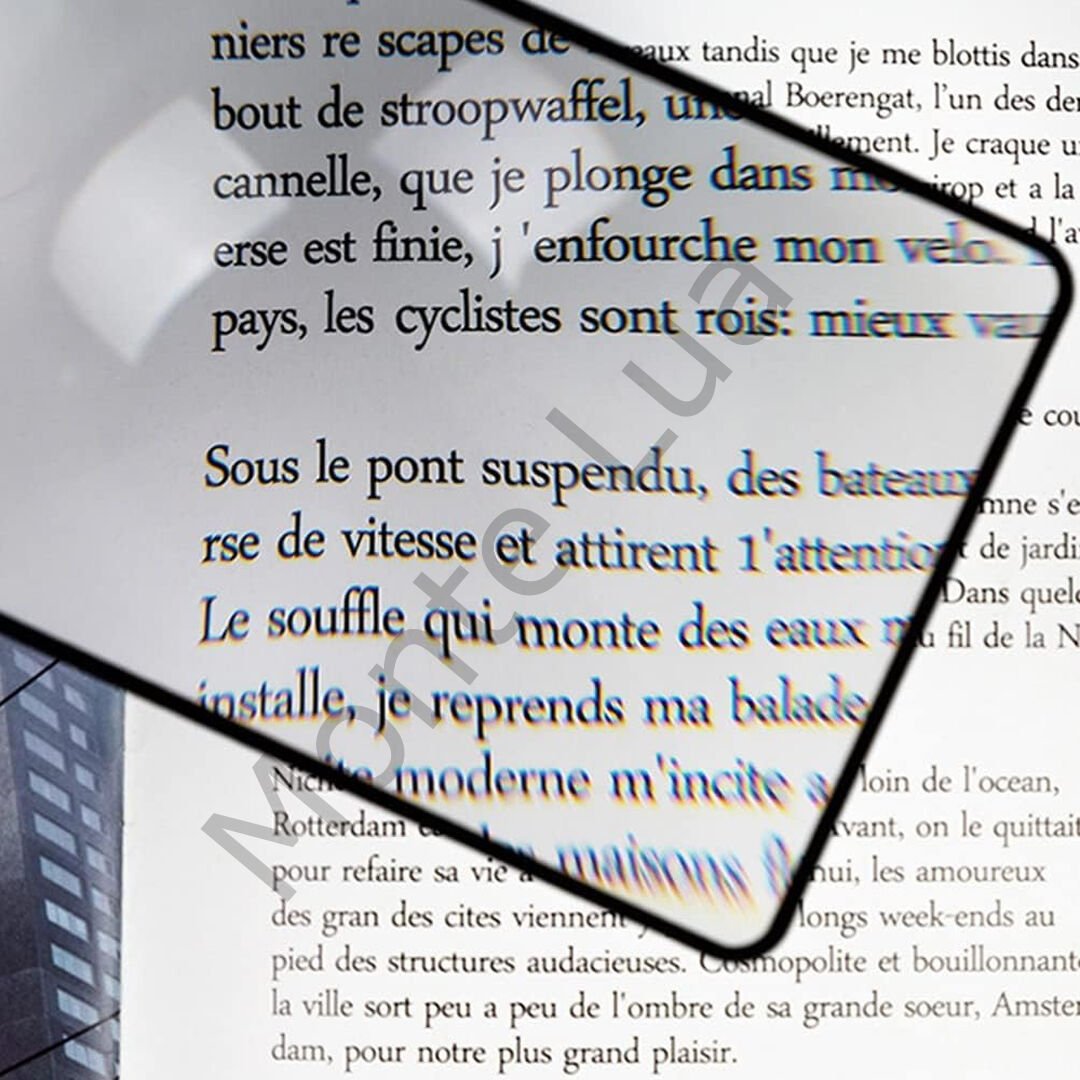 Kitap Okuma Büyüteci, 3 kat büyütme özelliği ile küçük yazıları rahatça okumanızı sağlar. 180x120mm boyutlarındaki geniş mercek alanı sayesinde daha geniş bir görüş alanı sunar. PVC malzemeden üretilen büyüteç, hafif ve dayanıklı yapısı ile uzun ömürlü kullanım sağlar. Kitap okuma, gazete okuma, harita inceleme ve el işi çalışmaları için ideal bir yardımcıdır.