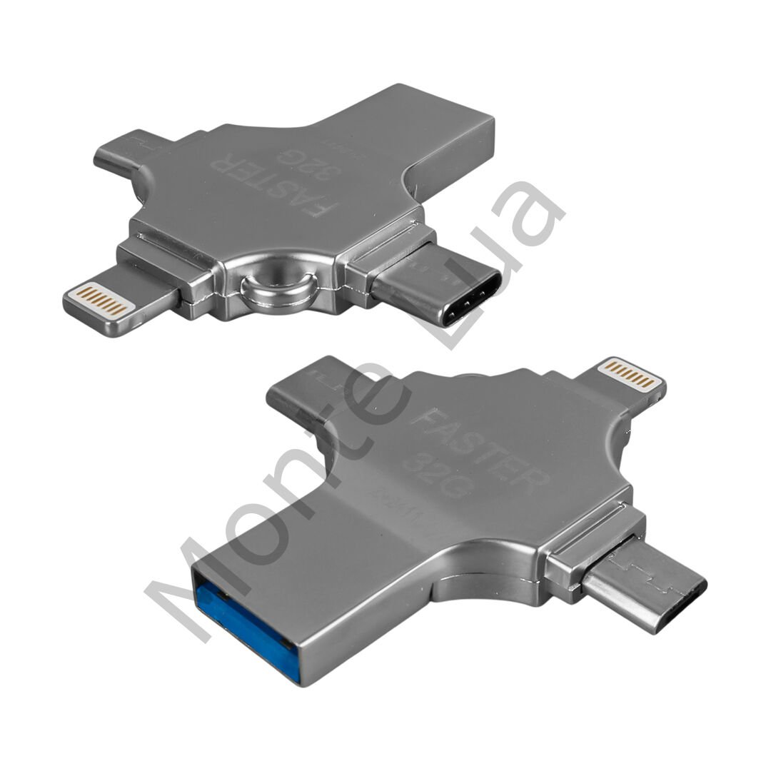 USB, Type-C, Micro USB, Lightning 4in1 çok işlevli USB bellektir. Fotoğrafları ve videoları (for) kolayca aktarır. Android Cihaz USB C vb. ürünlerde kullanılırken flash sürücüsünün yüklenmesini gerektirmez. Hafif ve ergonomik tasarımı ile taşınması çok kolaydır .