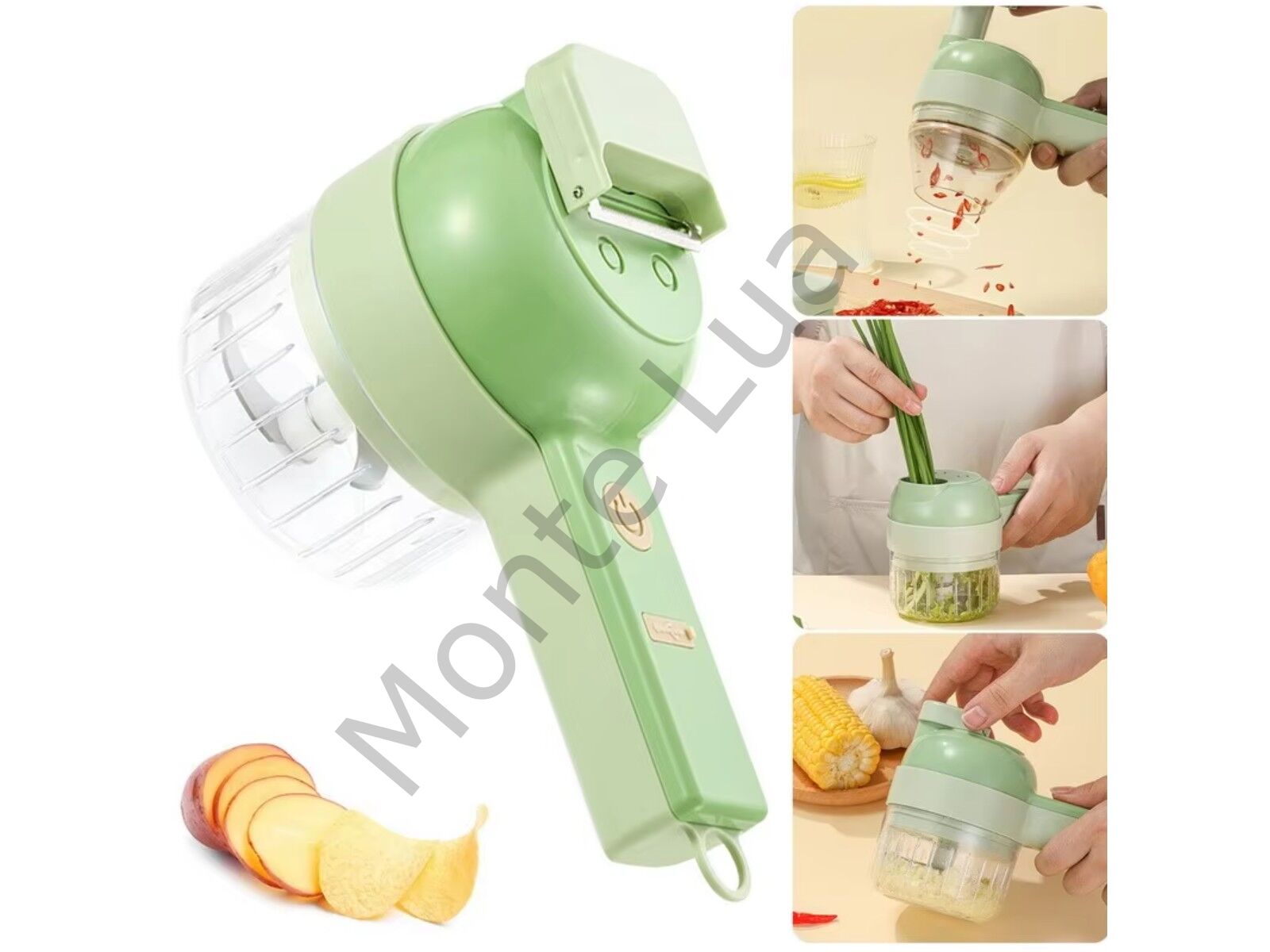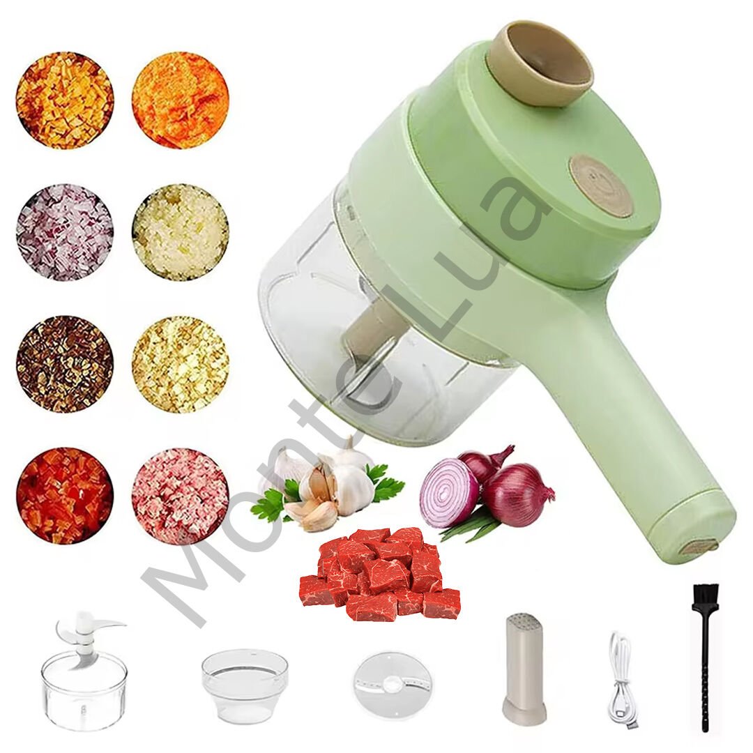 4'ü 1 Arada Şarjlı Sebze Kesici, Sebze, Sarımsak, Soğan için Şarjlı Parçalayıcı, Temizleme Fırçası, 2 Bıçak, Kaşık ve Patates Soyucu ile USB Şarjlı Mutfak Robotu.