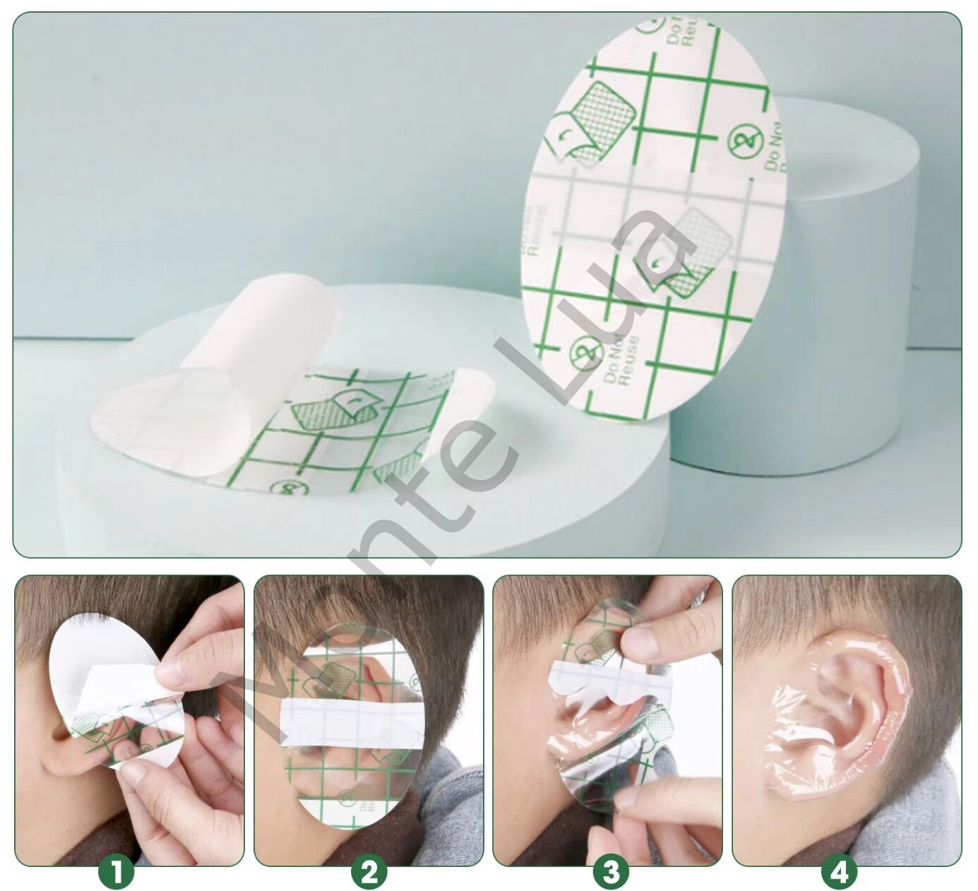 2. Su geçirmez kulak bantını çocuğun kulağını yapıştırın ve beyaz kağıdı yavaşça çıkartın.
